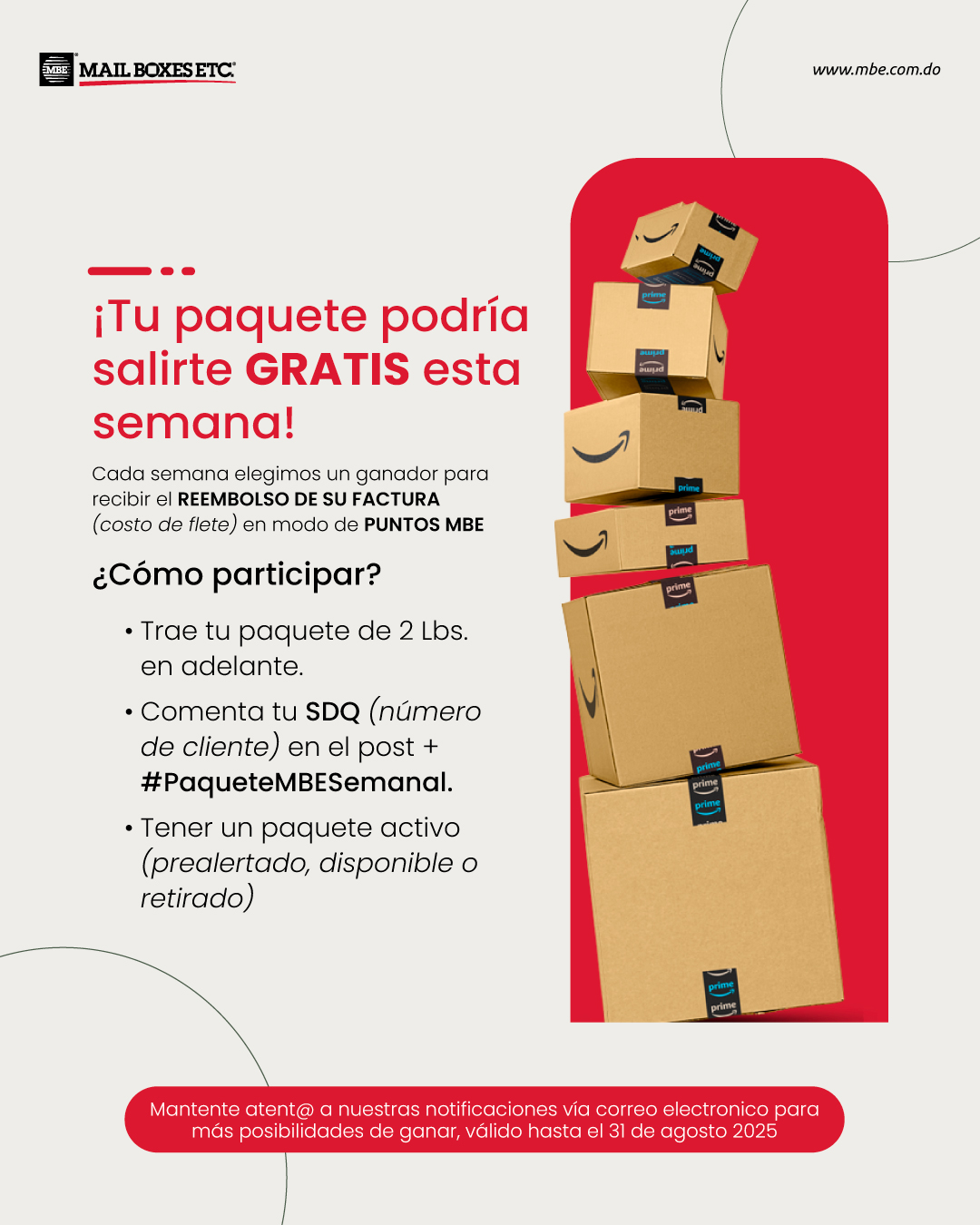 ¡Tu envío puede traerte un reembolso total del flete en Puntos MBE!. ¿Te imaginas que tu próximo paquete te salga completamente GRATIS? Con la nueva promoción “El Paquete MBE de la Semana”, puedes ganar el reembolso total del flete en forma de Puntos MBE. Así es, cada semana un cliente por sucursal podrá ser el afortunado ganador.
